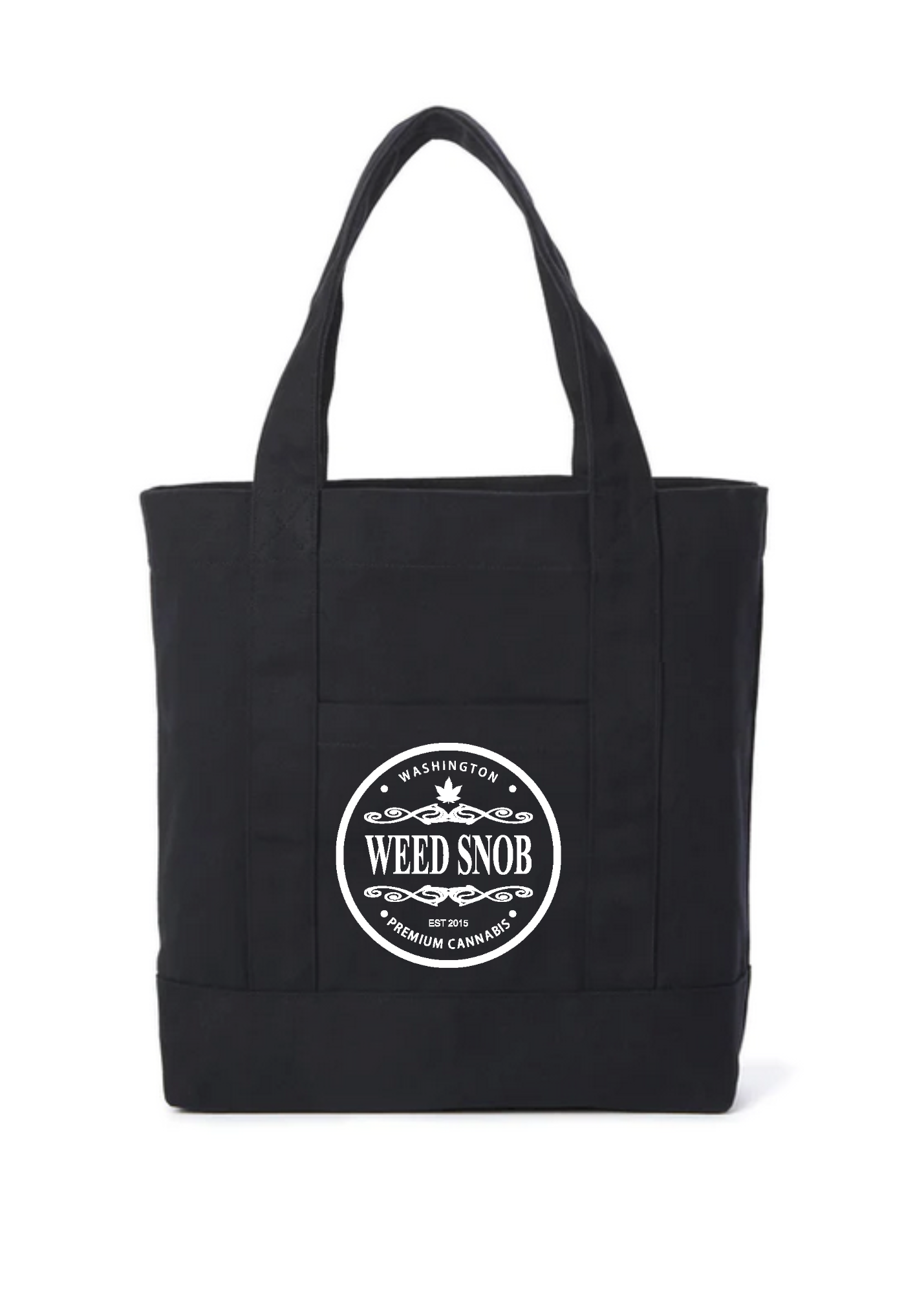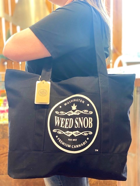 Black canvas bag, vinyl Weed Snob logo, 21″ x 15″ x 6″, heavy duty canvas with 8 x 8 outside pocket, top zipper closure, handle 1.5″ W x 25″ L, easy to carry or sling over shoulder